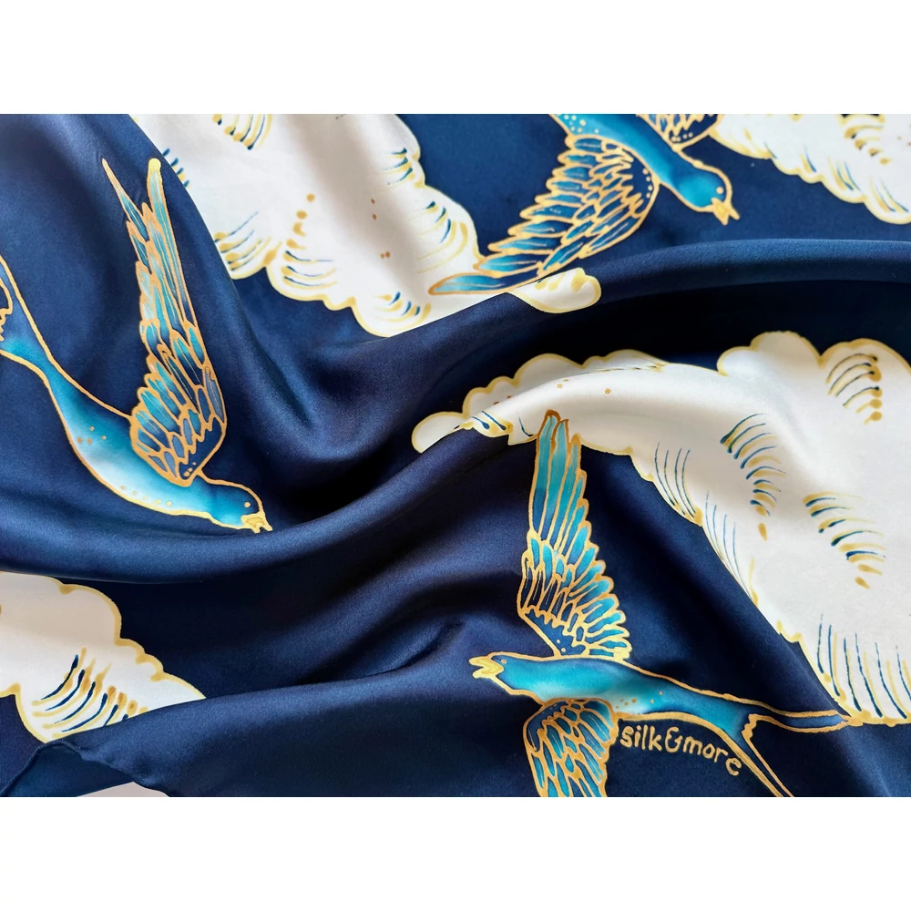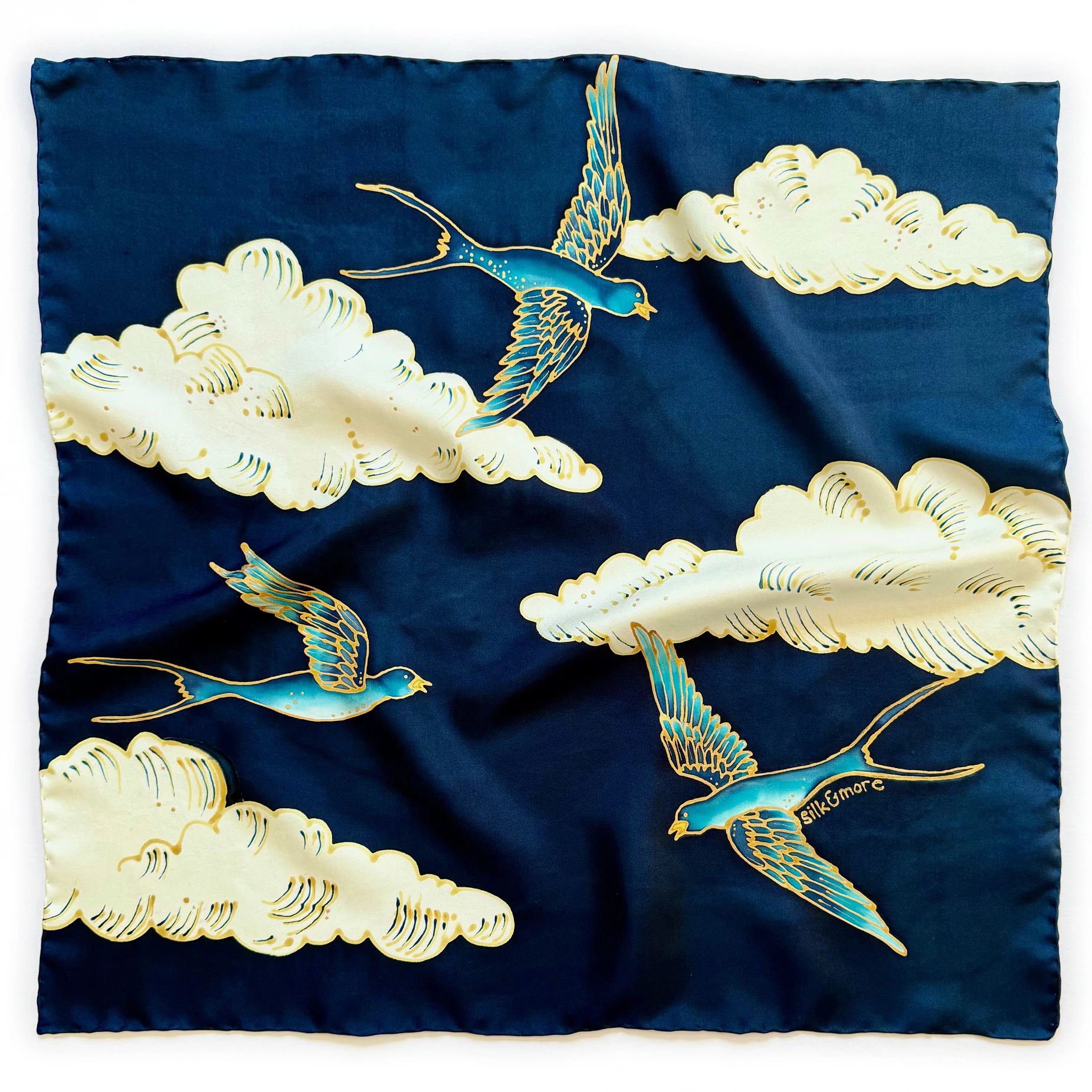 Mélykék alapon arany rajzolattal fecskék repkednek felhők között.