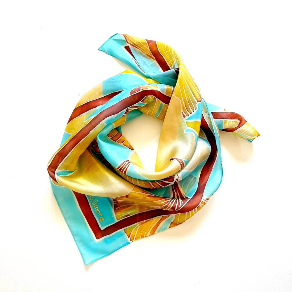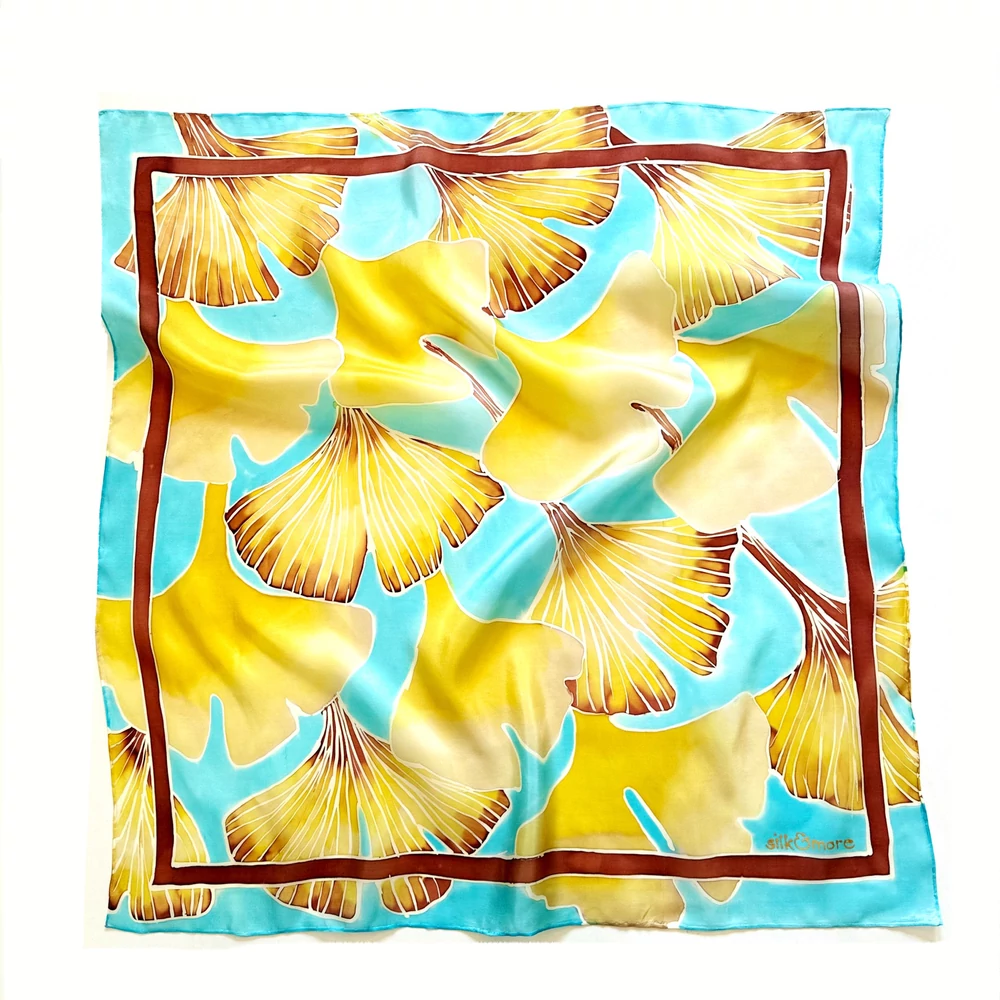 Ginkgo biloba vagy magyarul páfrányfenyő mintájú, meleg színvilágú selyemkendő.
